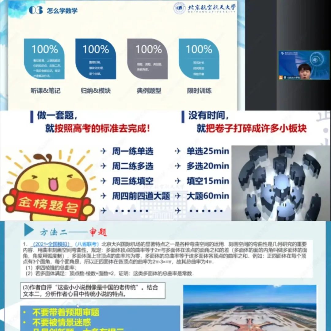 来自北航守锷书院的王峥、邢博辰、刘恩启、张漪帆四位同学分别从新高考的选科、等级赋分制、各学科的学习方法几个方面展开介绍,建议同学们在选科时要综合各学科特点及自身学习情况与大学意向志愿等因素进行选择,在学习中重视细节,学会整理归纳,同时提高学习效率,利用碎片化时间进行高效学习。
