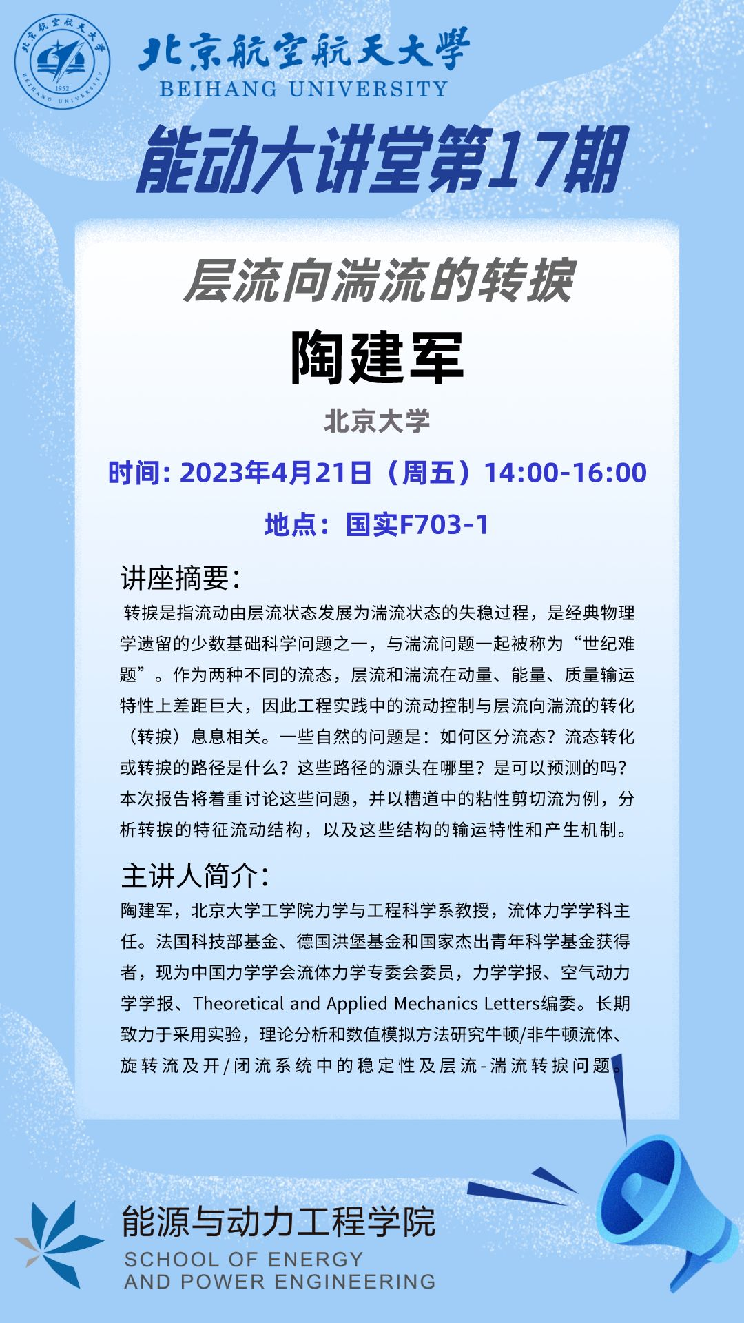 为了帮助同学们拓宽学术视野、了解学术前沿,能源与动力工程学院特别举办高端学术论坛,邀请北京大学陶建军教授开展以“层流向湍流的转捩”为主题的学术讲座,与同学们共同探讨转捩难题。