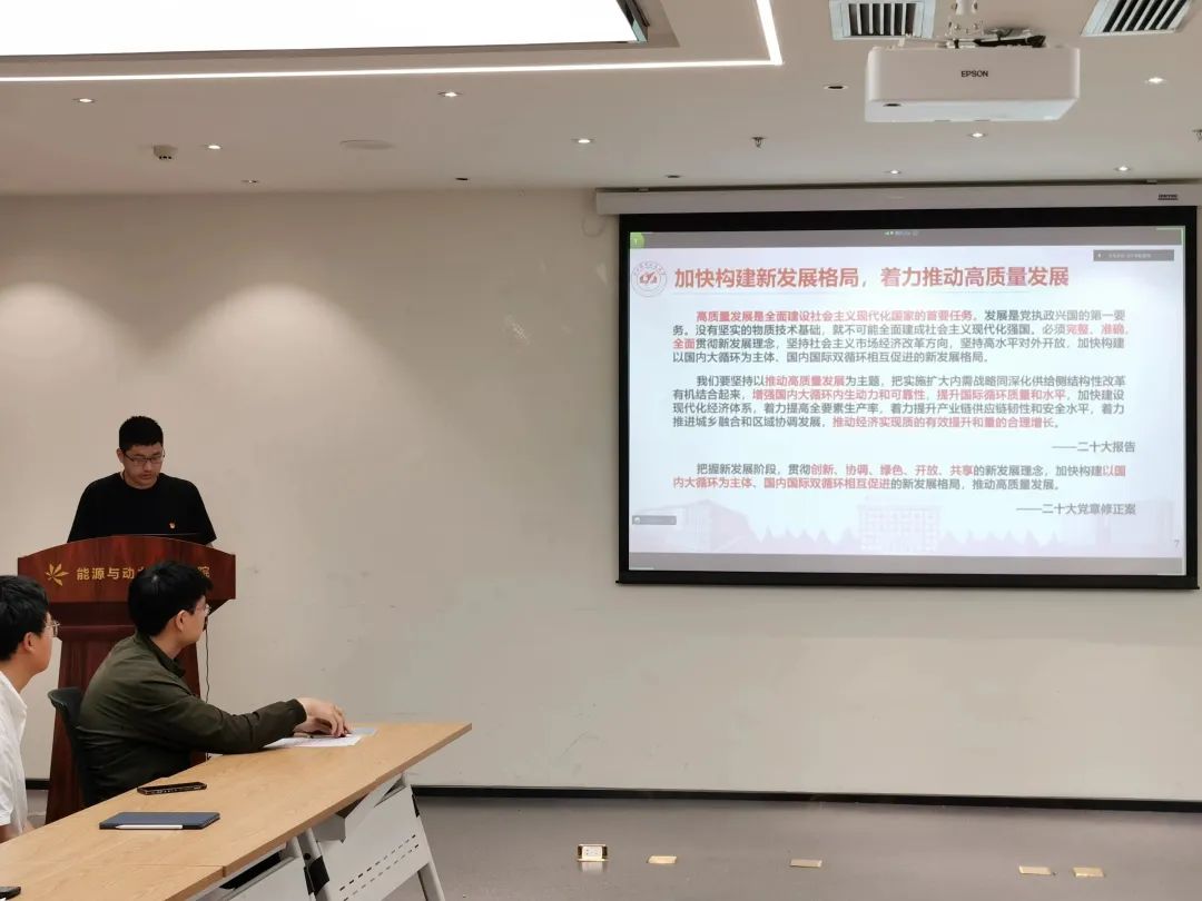动力学院党委书记董卓宁点评,学习贯彻党的二十大精神,学深悟透是基础、融会贯通是关键、全面落实是目的。强调要把握三点:首先学习要知其然,更知其所以然;其次要将自己代入学习内容,不做局外学习者;第三要学用贯通,思考怎么做,将大会精神真正落实到具体学习工作中。