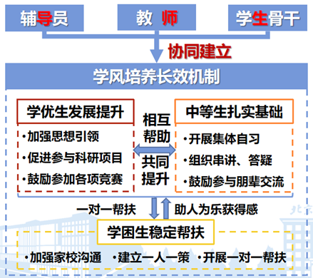 党团联动,以德育心培养学生理想信念;开展集体自习、考期答疑、考研保研经验分享等常态化学风建设活动,以智慧心因材施教培养人才;举办飞盘、篮球赛等班级特色体育活动,以体强心增强学生体质;协助开展学院美育活动、大班晚会,以美润心提升学生审美能力;协助开展劳育讲座、校园清扫等活动,以劳健心锤炼学生意志品质。